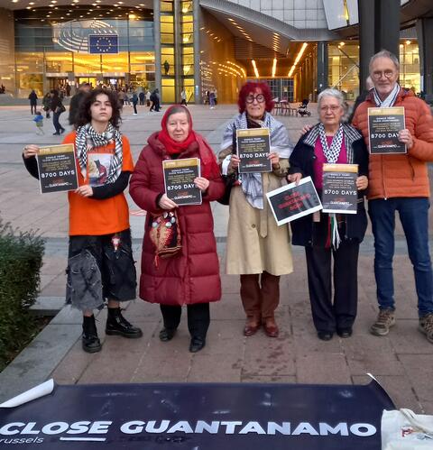 Campaigners outside the European Parliament in Brussels on November 5, 2025 during their monthly vigil for Guantánamo's closure, part of the monthly global vigils that have been taking place across the U.S. and around the world for the last three years.