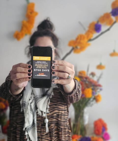 Ed Charles in Oakland, CA, the editor of the World Can't Wait's Spanish website, marks 8,700 days of Guantánamo's existence on November 5, 2025 with a Spanish version of the poster, and calls on Donald Trump to close it.