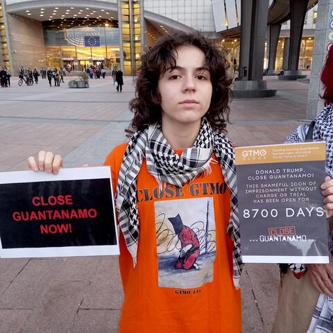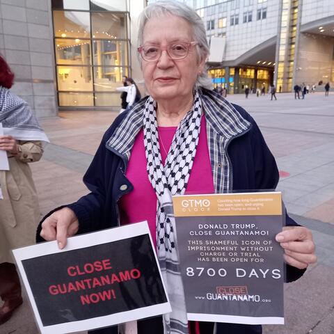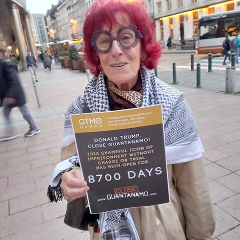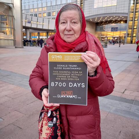 Mariefrance Deprez in Brussels marks 8,500 days of Guantánamo’s existence on April 19, 2025, and calls on Donald Trump to close it. Mariefrance is one of the regular participants in the "First Wednesday" monthly vigils for Guantánamo’s closure outside the European Parliament in Brussels which are part of the global monthly vigils for the prison’s closure that have been taking place across the U.S. and around the world for the last two years.
