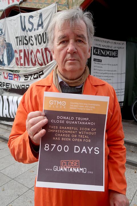 Luk Vervaet in Brussels marks 8,500 days of Guantánamo’s existence on April 19, 2025, and calls on Donald Trump to close it. Luk is one of the regular participants in the "First Wednesday" monthly vigils for Guantánamo’s closure outside the European Parliament in Brussels which are part of the global monthly vigils for the prison’s closure that have been taking place across the U.S. and around the world for the last two years.
