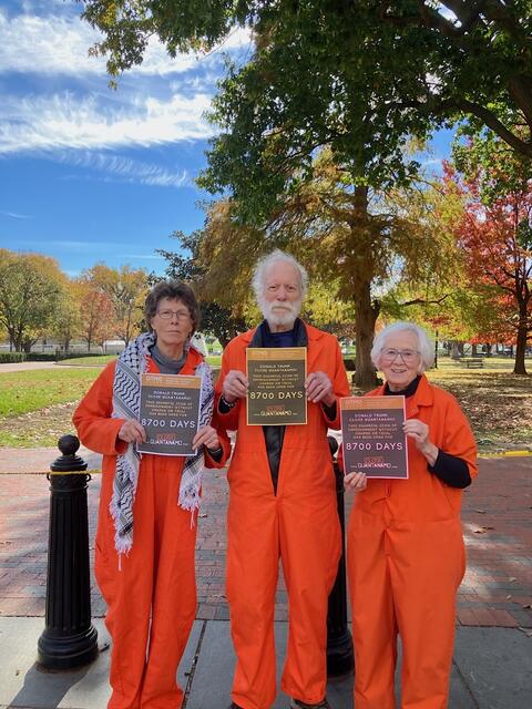 Helen Schietinger, Steve Lane and Judith Kelly outside the White House on November 5, 2025 during their monthly vigil for Guantánamo's closure, part of the monthly global vigils that have been taking place across the U.S. and around the world for the last three years. As Helen said, "Thank you for keeping the atrocity in somebody’s news!"