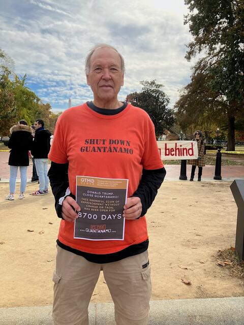 Art Laffin, Dorothy Day Catholic Worker, outside the White House on November 5, 2025 during D.C. campaigners' monthly vigil for Guantánamo's closure, part of the monthly global vigils that have been taking place across the U.S. and around the world for the last three years.