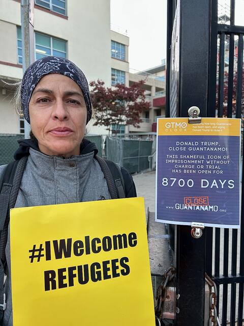 Another campaigner in San Francisco on November 6, 2025, during the monthly vigil for Guantánamo's closure by members of Amnesty International and the World Can't Wait, part of the monthly global vigils that have been taking place across the U.S. and around the world for the last three years.