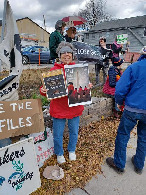 Marianna Massed sent this photo of Nancy Talanian of the Guantánamo Survivors Fund, and four others below, at the vigil for Guantánamo's closure on January 11, 2025, the 23rd anniversary of the opening of Guantánamo, on a snowy day in Greenfield, MA.