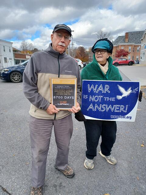 In Chatham, NY, Wendy Dwyer and Michael Richardson mark 8,400 days of Guantánamo's existence, and call on President Biden to take further steps to close it before he leaves office. Wendy is a peace and social justice activist, and Michael is an organizer with TH!RD ACT Upstate New York.